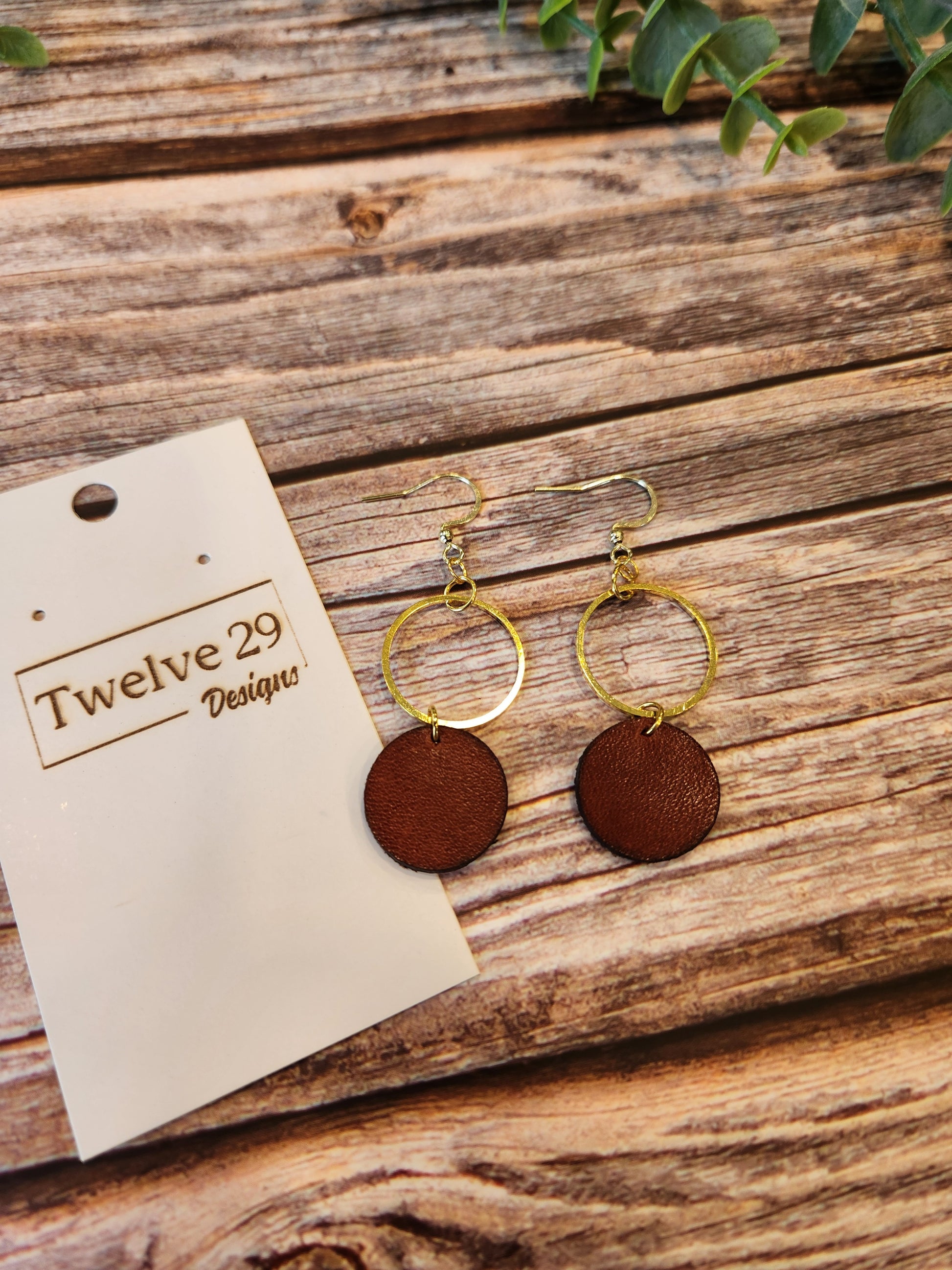 Leather Dangle Circle Earrings, English Tan with Golden Accents