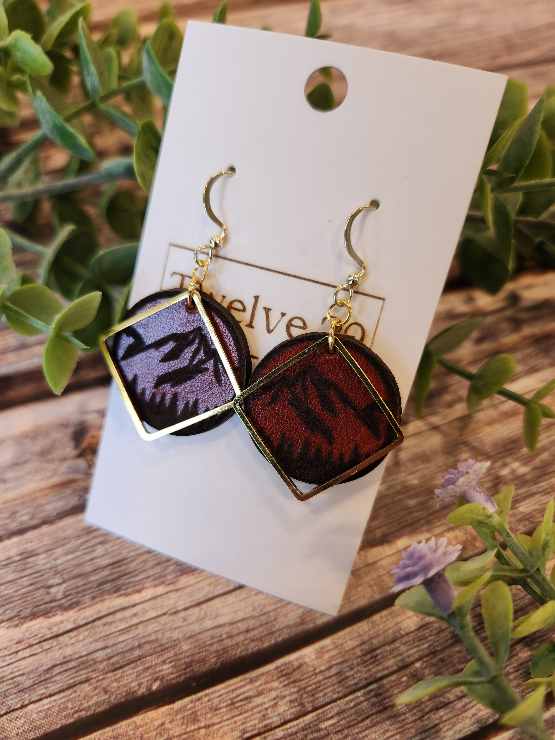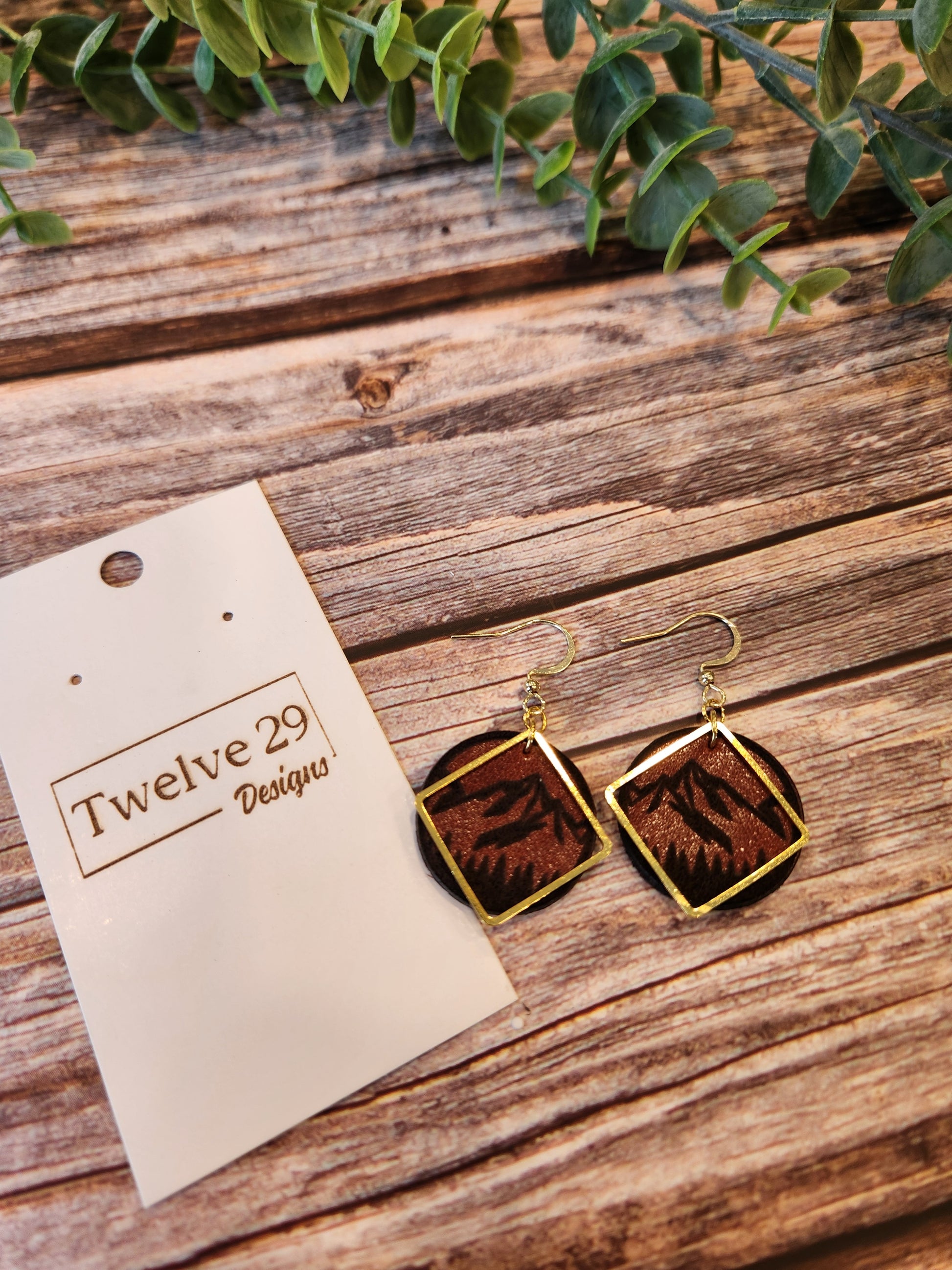Leather Earrings with Laser Engraved Mountains and Gold Colored Accents