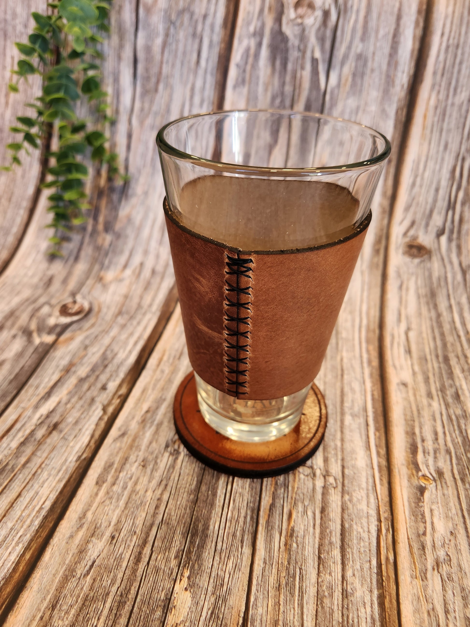 Raise a glass to craftsmanship that lasts. Each of our 16oz pint glasses comes wrapped in a hand-cut, hand-stitched sleeve made from full-grain leather—the finest and most durable available. The natural grain, warm tones, and soft finish give every piece a character all its own, aging beautifully with each use.