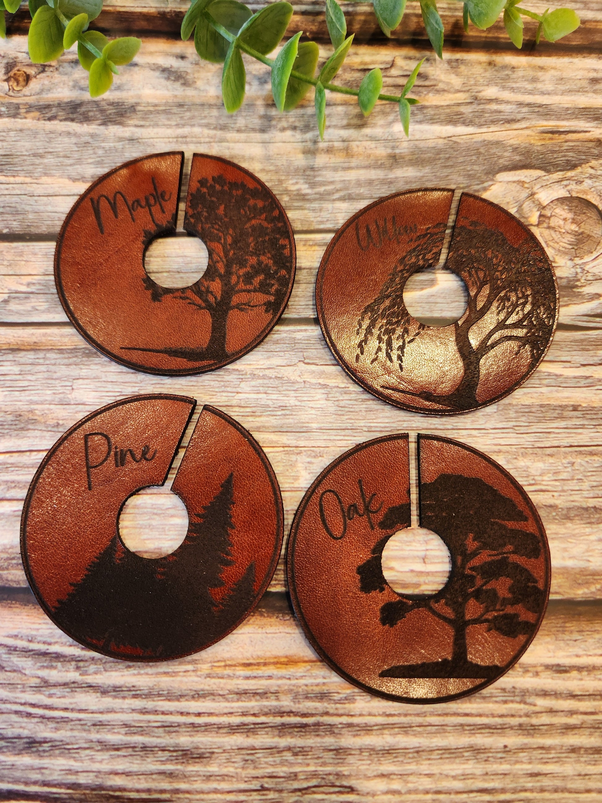Elevate your entertaining experience with this exclusive set of four genuine full grain leather wine glass markers, thoughtfully designed for the discerning host. Each marker features a refined laser-engraved tree motif, symbolizing strength, growth, and natural elegance. This set includes Oak, Maple, Willow and Pine. Handcrafted with meticulous attention to detail, these sophisticated accents offer a timeless way to distinguish glasses while adding a touch of understated luxury to any gathering.