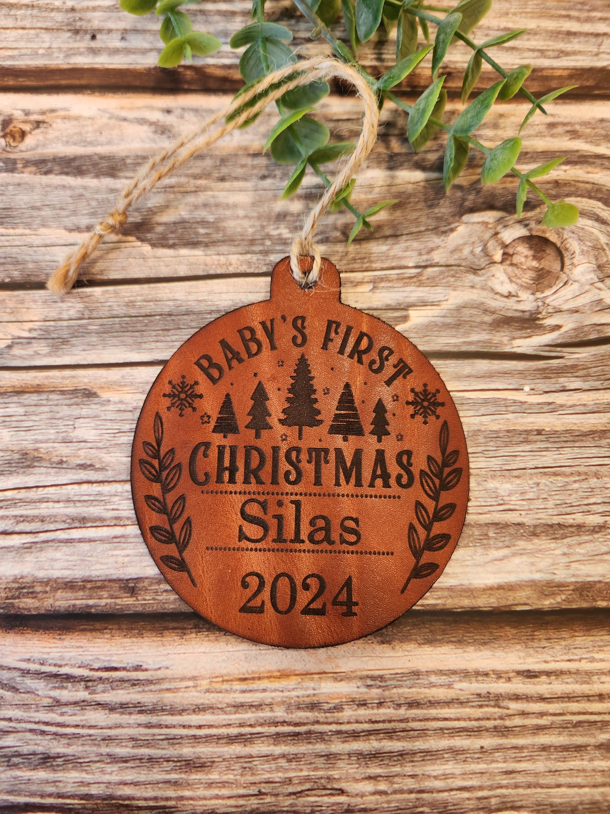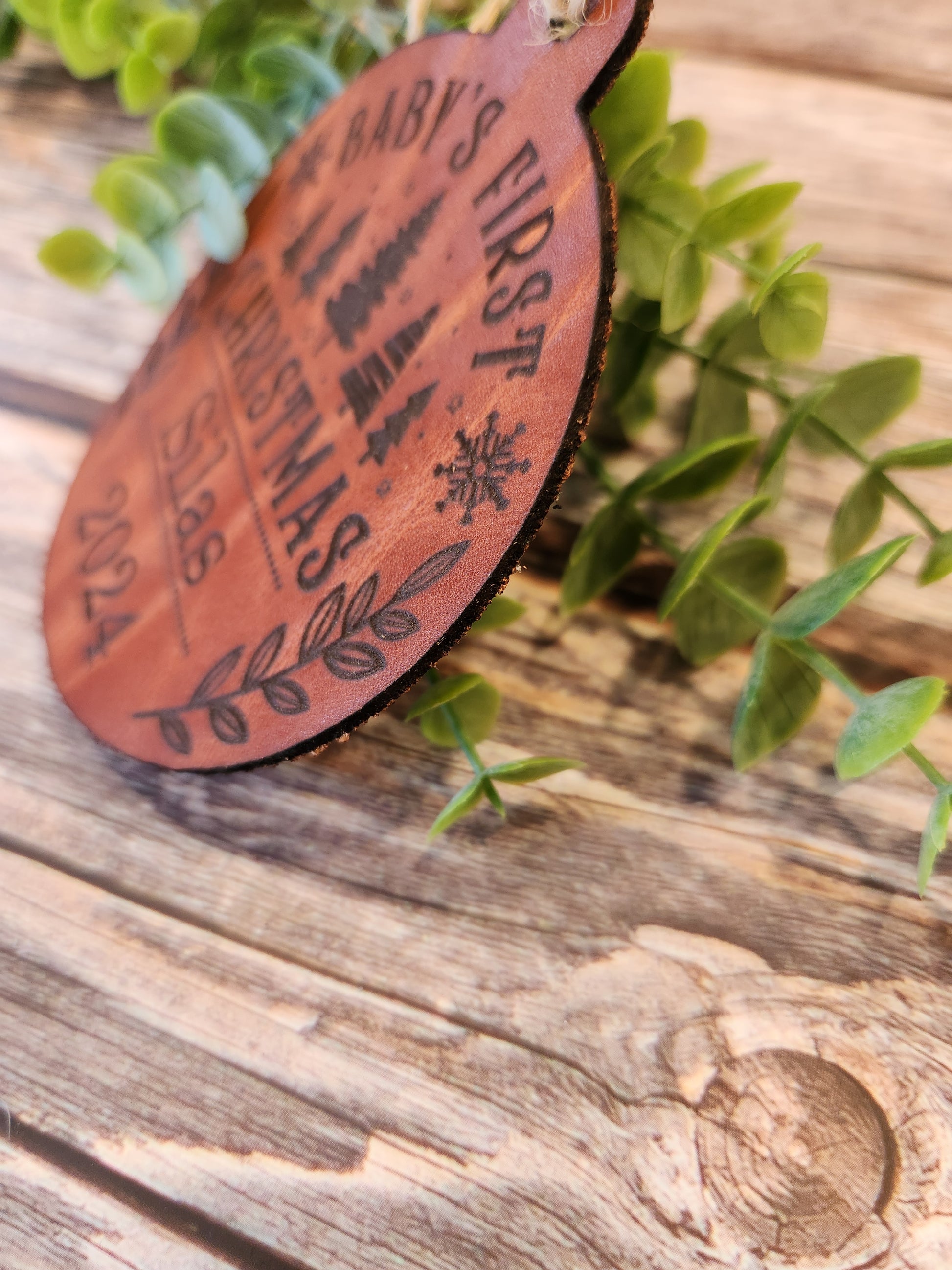 Personalized Full-Grain American Leather “Baby’s First Christmas” Ornament | Custom Name & Year | Heirloom Keepsake | Handmade in the USA