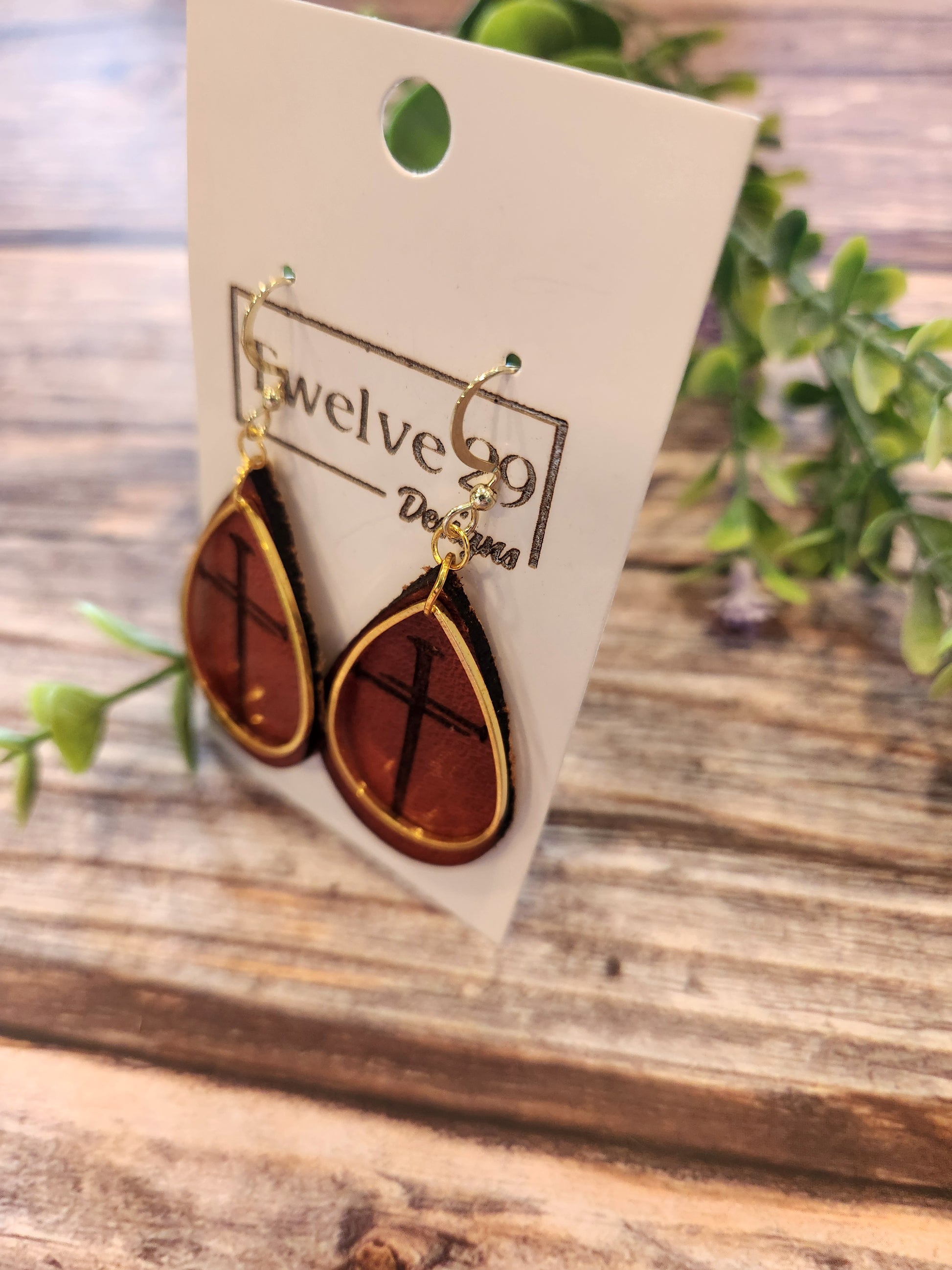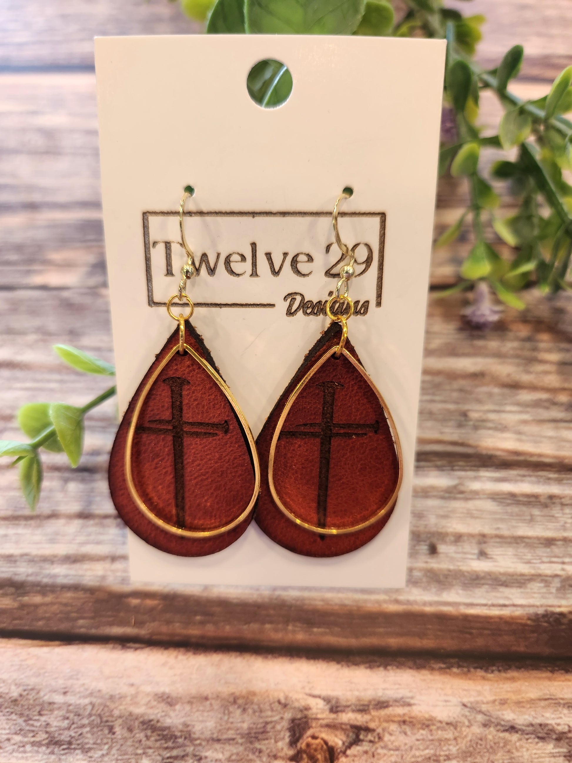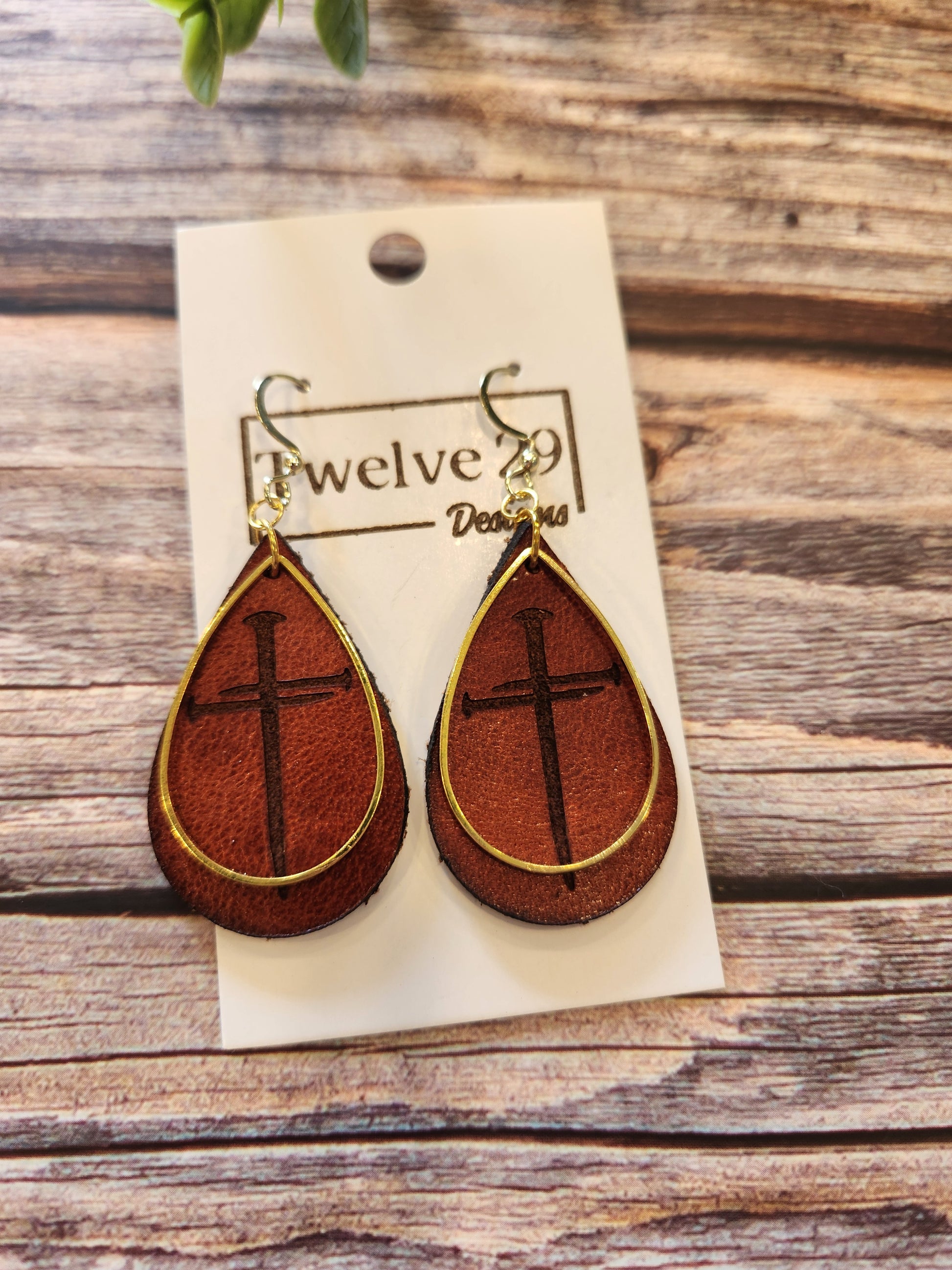 Full-Grain American Leather, Three Nail Cross Teardrop Shape Earrings – Handcrafted with Optional Metal Accent | Handmade in the USA
